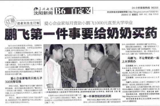 提供長期資助的是沈陽奧吉娜化工有限公司董事長魏國平,他在6月9日看到本報報道的馬鵬飛事跡后,決定從每月的個人收入中拿出1000元送給馬鵬飛和他的奶奶。