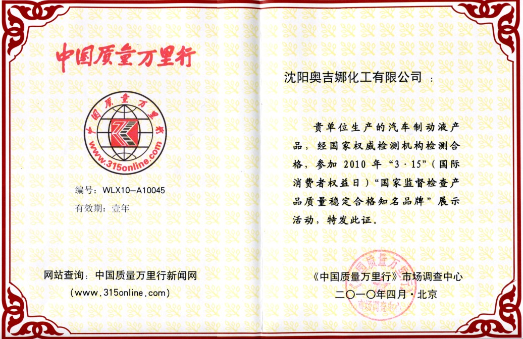 記者從沈陽奧吉娜化工有限公司獲悉,該公司制動液產品參加中國質量萬里行舉辦的“3.15國際消費權益日”活動,獲得國家監督檢查質量穩定合格知名品牌榮譽。沈陽奧吉娜由留法博士魏國平創建于1991年,是中國潤滑油行業歷史最悠久的民族品牌。早在1993年就被原國家經貿委(現發改委)確立為中國高檔汽車制動液中試基地,獲得“八五”國家技術創新優秀項目獎,通過美國西南研究院臺架實驗。公司以自主創新為企業核心發展動力,與國內外多個科研院所、數位院士共同進行新產品和新技術的研制。2005年和2007年獲國家發改委兩大國債項目的批準。