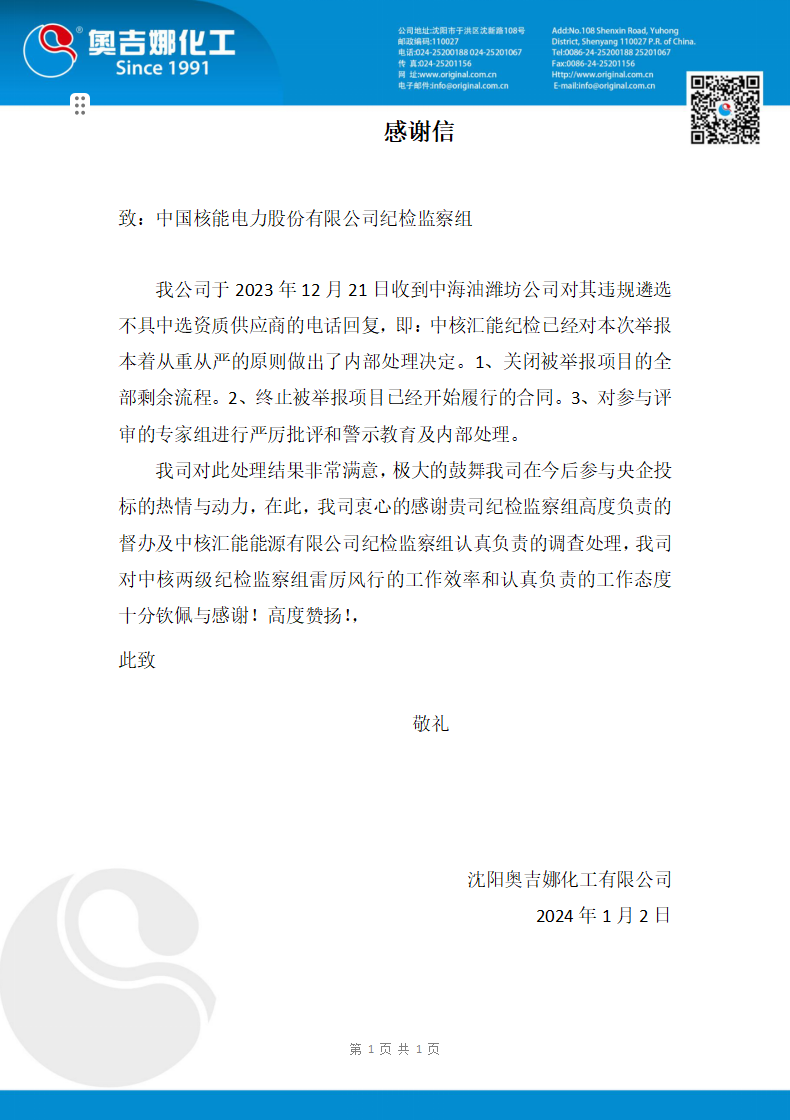 2024年1月2日,新年伊始第一個工作日,奧吉娜公司便懷著無比真誠、敬重的心情寄出了一封感謝信,感謝信是寫給中國核能電力股份有限公司紀(jì)檢監(jiān)察組的,奧吉娜為什么要寄出這封感謝信呢?