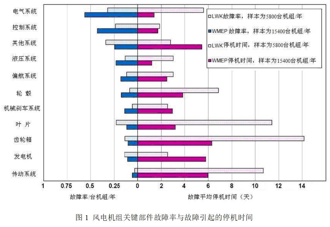 據(jù)風(fēng)電機(jī)組主要零部件可靠性研究表明,在風(fēng)電機(jī)組的故障中電氣和控制系統(tǒng)故障率最高,齒輪箱故障率相對較低,但通過進(jìn)一步統(tǒng)計(jì)顯示,電氣和控制系統(tǒng)的故障容易排除,停機(jī)時間短,而齒輪箱引起的故障難以排除,費(fèi)用大并造成長時間停機(jī),最長達(dá)到半月之久(詳見圖 1)。
